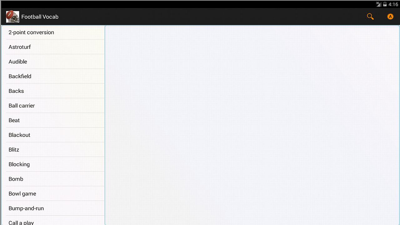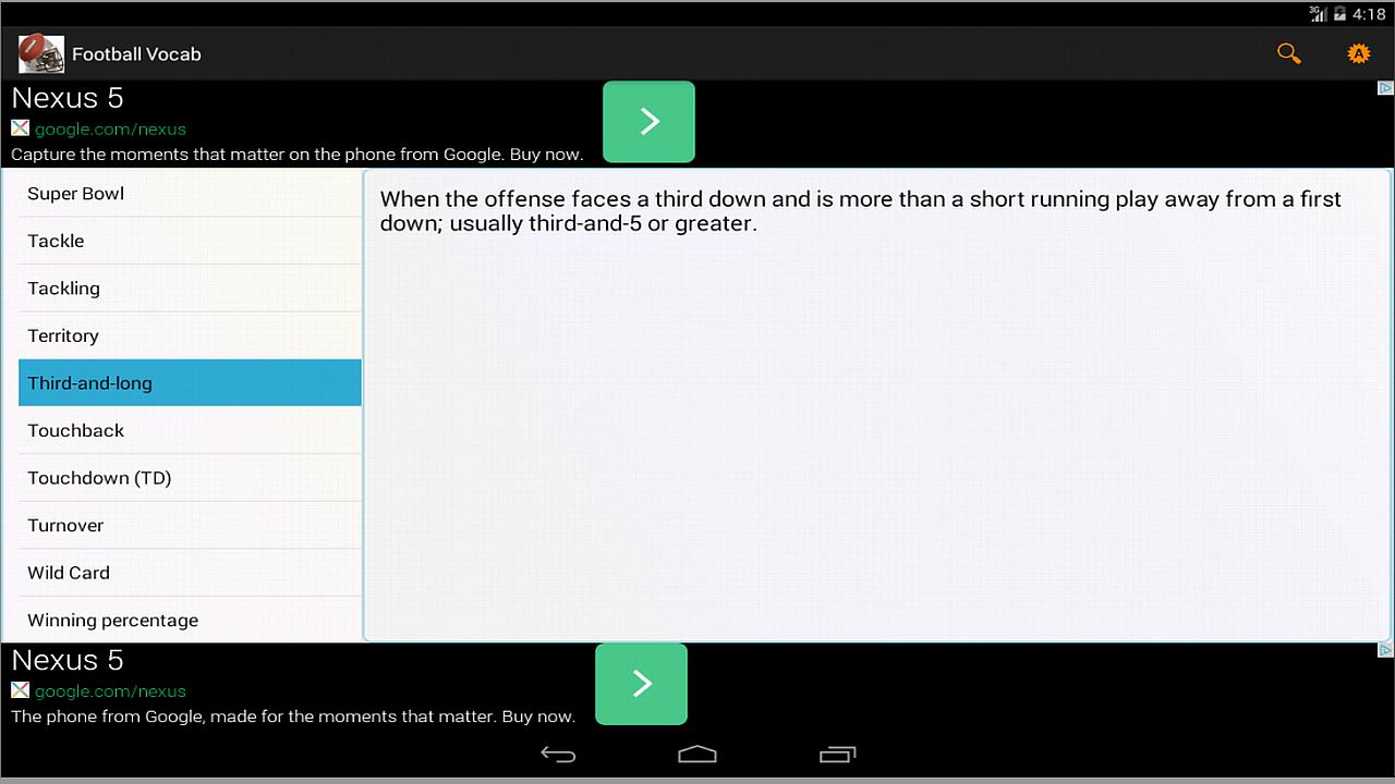 あなたの仲間や重要な他の人がスポーツについて議論するとき、あなたは無数のサッカーの言葉で迷子になっていると感じますか?パントは本当にどういう意味ですか?ドロップキックとは何ですか?ラテラルパスとは何ですか?このアプリでは、通常の言語で各用語の明確な定義を明確に定義することにより、アメリカンフットボールの世界を分かりやすくしようとしました。このアプリは一般の人々を対象としていますが、専門家のサッカーファンは新しい用語を1つか2つ獲得するかもしれません。